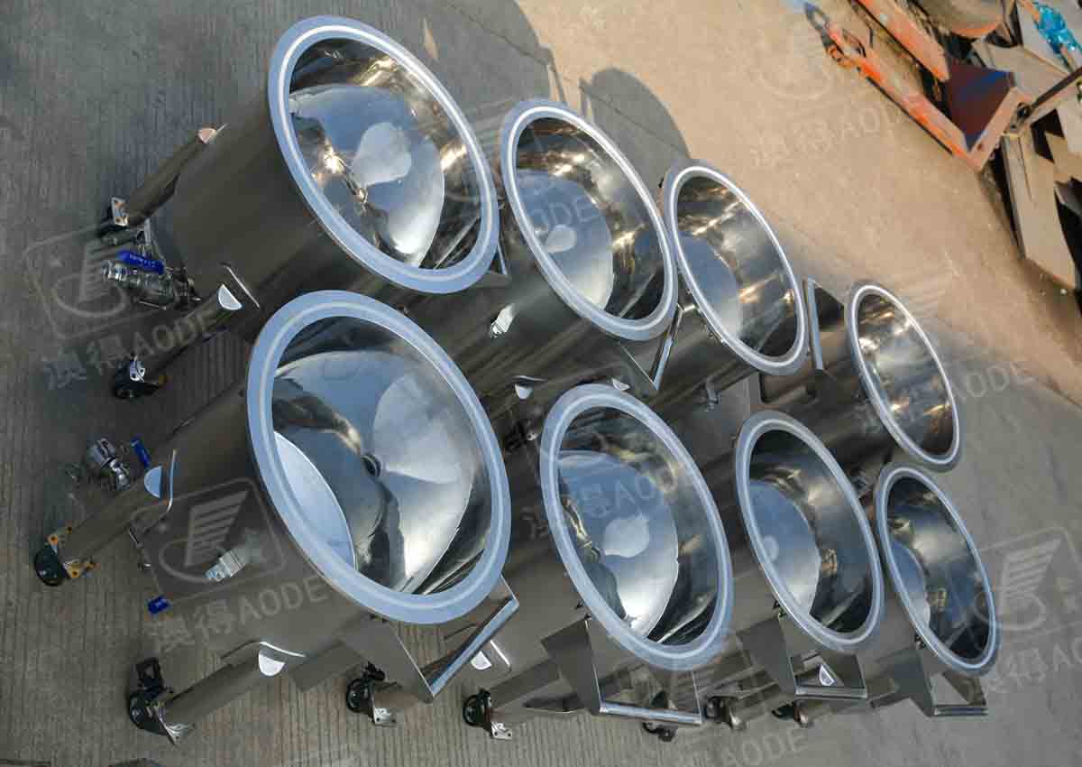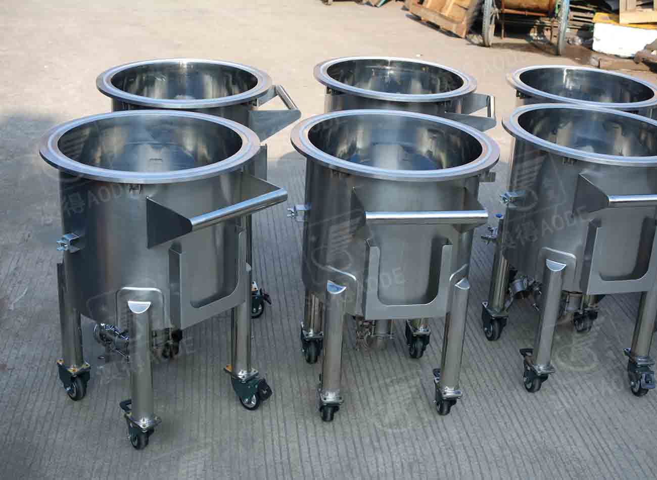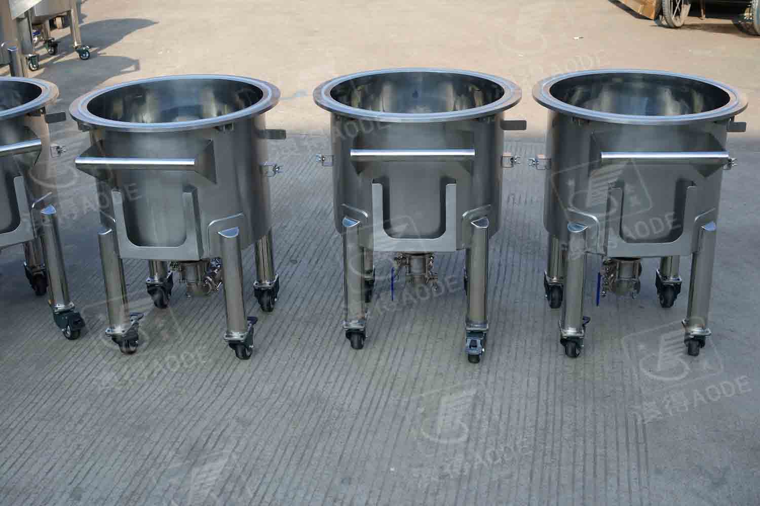 配放料閥,缸底可定制為平底傾斜出料,或圓底錐底中心出料,下有移動(dòng)輪,帶自剎車(chē)裝置。